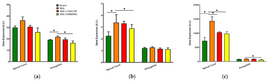 Effect of turmeric bioactive compounds supplementation on IBA-1 (a), CD11b (b), and GFAP (c) mRNA expression in the spinal cord and amygdala of SNL rats. Data are expressed as mean ± SEM. Four groups included Sham, SNL, SNL+SNL+100CUR (100 mg curcumin C3 complex®/BW daily), and SNL+50BDMC (50 mg bisdemethoxycurcumin/BW daily). n = 5–6 animals per group. Data were analyzed by unpaired t-test Sham vs. SNL, SNL vs. SNL+100CUR, and SNL vs. SNL+50BDMC. * p < 0.05.