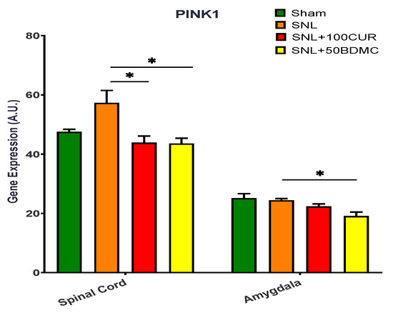 Dysregulation of the autophagic machinery has been associated with NP mechanisms [52], including in the SNL model [53]. PINK1 is a PTEN (phosphatase and tensin homolog) induced mitochondrial kinase that can be selectively mobilized under mitochondrial stress conditions and lead to the induction of mitophagy [54]. We found an upregulation of PINK1 gene expression in the lower spinal cord in the SNL model, which agrees with a previous study showing that in the SNL model, PINK1 was significantly expressed in the neurons of the spinal dorsal horn, and the expression of PINK1 was increased selectively in GABAergic interneurons [54]. Our findings that both CUR and BDMC reverted SNL-induced PINK1 gene expression in CNS tissues implicate PINK1 gene down-regulation in the anti-nociceptive effects of curcumin in NP.