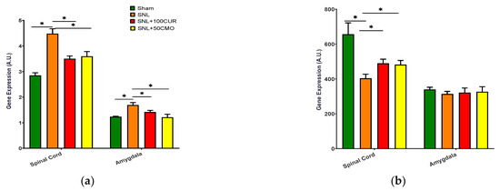 Limitations of the study include the following: (i) due to the limited amount of available tissues of spinal cord and amygdala, this study was not able to assess protein expression using either Western blot or immunohistochemistry, and (ii) only male rats were used in the present study. Future studies are warranted (i) to conduct additional experiments for protein expression in order to confirm the results of gene expression in both tissues, (ii) to evaluate CUR and BDMC in female rats with NP for any gender differences, and (iii) to employ transcriptomic profiling by RNA-seq and metabolites analyses for the better understanding of how CUR and BDMC affect metabolic changes in animals with NP.