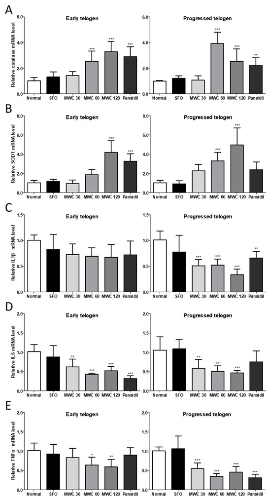 3.4. Effects of MWC on Gene Expression of Antioxidant Enzymes and Inflammatory Cytokines in an Anagen-Synchronized Mouse Model