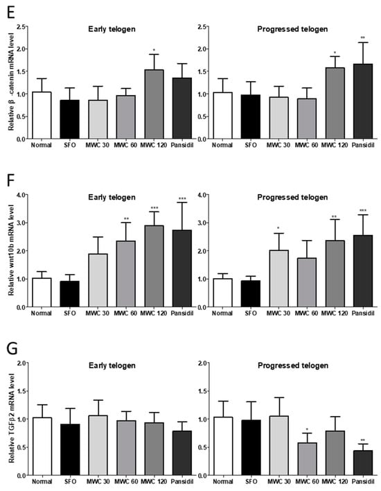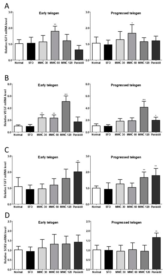 3.5. Effects of MWC on Gene Expression of Growth and Hair-Growth-Related Factors in Anagen-Synchronized Mouse Model