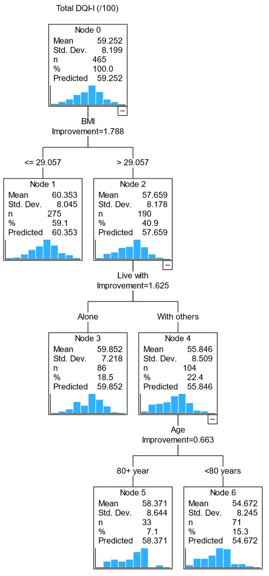 Separate tree diagrams were constructed for DQI-I subcomponents (Figure S1). In each tree diagram, BMI remains a key (first) independent variable for all subcomponents, except for moderation, where sex was a predictor of moderation score (male sex has a lower moderation score). The second independent variable varies across the DQI-I subcomponents: living arrangement for diet variety, medication for adequacy and NEADL for balance.