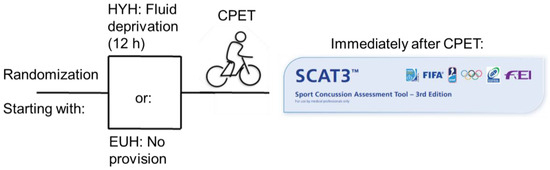 The figure depicts the study protocol: randomized start with either the EUH or HYH scenario. Participants were placed on a cycle ergometer with an individualized ramp protocol. SCAT3 was assessed immediately after completion of the exercise test.