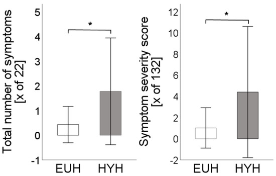 Total number of symptoms [x of 22] and symptom severity score [x of 132] are depicted for the euhydrated state [EUH, white bars] and hypohydrated state [HYH, grey bars], *: p < 0.01.