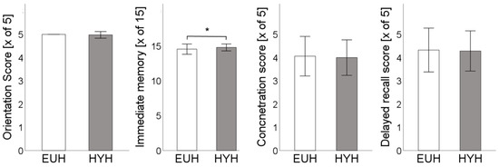 Orientation Score [x of 5], immediate memory score total [x of 15], concentration score [x of 5], and delayed recall score [x of 5] are depicted for the euhydrated state [EUH, white bars] and hypohydrated state [HYH, grey bars], *: p < 0.05.