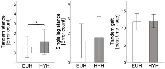 Error count in tandem stance and single leg stance as well as best time (out of four attempts) in tandem gait [sec.] are depicted for the euhydrated state [EUH, white bars] and hypohydrated state [HYH, grey bars], *: p < 0.05.