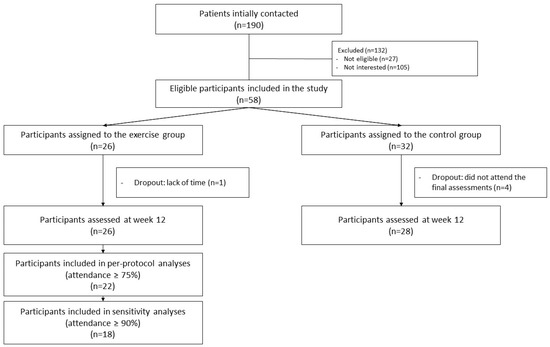 | All (n = 58) | Exercise (n = 26) | Comparison (n = 32) | p | |