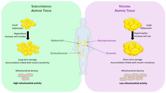 VAT can constitute a significant portion of total body fat, accounting for up to 40% of the overall fat mass. It is distributed between the omental and retro-peritoneal regions, as depicted in Figure 1 and summarized in Table 1, and exerts a substantial metabolic impact on health. VAT is characterized by the presence of large adipocytes [], and its expansion primarily occurs through hypertrophy, with limitations imposed by its anatomical location []. Due to its relatively lower storage capacity compared to scAT, lipids must be redistributed to liver and muscles, which can lead to insulin resistance in these tissues []. Indeed, studies have consistently indicated that the accumulation of vAT, but not scAT, poses a high risk for the development of insulin resistance and type 2 diabetes (T2D) [].