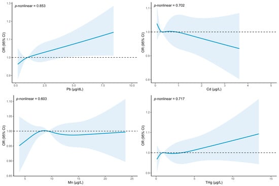 | THg (µg/L) | 1.02 (0.97–1.08) | 0.424 | 1.01 (0.96–1.07) | 0.629 | 1.04 (0.97–1.10) | 0.271 |
