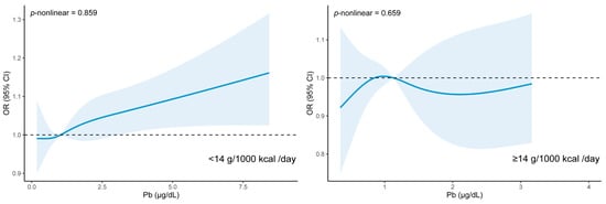 Chicago/Turabian StyleLi, Bin, Fengzhan Zhang, Haoqi Jiang, Chen Wang, Qihong Zhao, Wanshui Yang, and Anla Hu. 2023. "Adequate Intake of Dietary Fiber May Relieve the Detrimental Impact of Blood Lead on Dyslipidemia among US Adults: A Study of Data from the National Health and Nutrition Examination Survey Database" Nutrients 15, no. 20: 4434. https://doi.org/10.3390/nu15204434