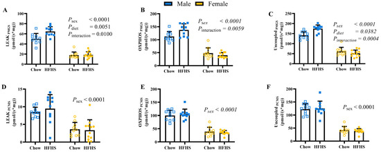 Two sets of substrates and inhibitors were added to assess respiration rates at several states in duplicate. Rates for Run 1 were measured following the addition of pyruvate (P, 5 mm) and malate (M, 1 mM) (LEAKPM); PM with ADP (2 mM) (OXPHOSPM); PM, ADP, glutamate (G, 10 mM PMG P), and succinate (S, 10 mM) (OXPHOSPMGS); PMGS, ADP, and oligomycin (2 μg mL−1, LEAKPMGS). Rates for Run 2 were measured following the addition of Palmitoylcarnitine (PC, 50 μM) and malate (M, 1 mM) (LEAKPCM); PCM with ADP (2 mM) (OXPHOSPCM); PCM, ADP, and succinate (S, 10 mM) (OXPHOSPCMS); PCMS, ADP, and oligomycin (2 μg mL−1) (LEAKPCMS). Both runs ended with 0.5 μM stepwise titration of 4-(trifluoromethoxy) phenylhydrazone (FCCP) until maximal uncoupling was achieved (electron transfer system capacity (E)). Cytochrome c (10 μM) was also added during both runs to determine that mitochondrial membrane damage was minimal and the same between runs. Runs were accepted with a less than 5% increase with cytochrome c addition. Respiration ratios were calculated as a ratio of LEAK/OXPHOSPM, LEAK/OXPHOSPCM, LEAK/OXPHOSPMGS, LEAK/OXPHOSPCMS, OXPHOS/UncoupledPMGS, and OXPHOS/UncoupledPCMS (n = 10 M-Chow, 10 M-HFHS, 10 F-Chow, 12 F-HFHS for all respiration measurements).