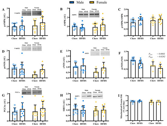 The gastrocnemius was flash frozen for the determination of protein content of targets of interest. Tissues were powdered with liquid nitrogen in lysis buffer (MPER (Thermo Scientific, Waltham, MA, USA) with 150 mmol/L NaCl, 1 mmol/L EDTA, 1 mmol/L EGTA, 5 mmol/L Na4P2O7 10H2O), 1 mmol/L Na3PO4, 20 mmol/L NaF, 500 mmol/L okadaic acid, 1% protease inhibitor cocktail (Sigma Aldrich, St. Louis, MO, USA)), and further processed with a rotor-stator homgenizer. Lysate protein concentration was determined by the Bradford method and equal protein was resolved on 4–15% SDS-PAGE gels followed by transfer to a PVDF membrane. Data for each target were collected across multiple blots due to the number of samples and the constraints of gel capacities. Each blot included samples from each group to avoid blot-to-blot bias. Equal protein loading and transfer were confirmed with ponceau staining. Cross-blot variability was controlled with a consistent loading control sample with which data were normalized. Membranes were probed with specific antibodies for peroxisome proliferator-activated receptor gamma coactivator 1-alpha (PGC1α, RRID:AB_881987, 1:500) (n = 9 M-Chow, 9 M-HFHS, 10 F-Chow, 12 F-HFHS), total endothelial nitric oxide synthase (eNOS, RRID:AB_329863, 1:500) (n = 9 M-Chow, 10 M-HFHS, 5 F-Chow, 6 F-HFHS), Ser1177 phosphorylated eNOS (peNOS, RRID:AB_329837, 1:500) (n = 9 M-Chow, 10 M-HFHS, 5 F-Chow, 6 F-HFHS), total 50 AMP activated protein kinase (AMPK, RRID:AB_330331, 1:500) (n = 9 M-Chow, 10 M-HFHS, 10 F-Chow, 11 F-HFHS), Thr172 phosphorylated AMPK (pAMPK, RRID:AB_330330, 1:500) (n = 9 M-Chow, 10 M-HFHS, 10 F-Chow, 11 F-HFHS), mitofusin-1 (Mfn1, RRID:AB_11142211, 1:500) (n = 10 M-Chow, 11 M-HFHS, 10 F-Chow, 10 F-HFHS), mitofusin-2 (Mfn2, RRID:AB_10999860, 1:500) (n = 10 M-Chow, 11 M-HFHS, 11 F-Chow, 10 F-HFHS), mitochondrial fission factor (MFF, RRID:AB_2734126, 1:500) (n = 10 M-Chow, 11 M-HFHS, 11 F-Chow, 10 F-HFHS), dyamin-related protein 1 (Drp1, RRID:AB_11178663, 1:500) (n = 10 M-Chow, 11 M-HFHS, 11 F-Chow, 10 F-HFHS), phosphorylated Drp1 (pDRP1, RRID:AB_2085352, 1:500) (n = 10 M-Chow, 11 M-HFHS, 11 F-Chow, 10 F-HFHS), NAD-dependent siturin-1 (SIRT-1, RRID:AB_2617130, 1:500) (n = 10 M-Chow, 11 M-HFHS, 11 F-Chow, 10 F-HFHS), manganese superoxide dismutase (MnSOD, RRID:AB_300434, 1:500) (n = 8 M-Chow, 9 M-HFHS, 8 F-Chow, 7 F-HFHS), Sestrin2 (Ses2, RRID:AB_11178663, 1:500) (n = 10 M-Chow, 10 M-HFHS, 11 F-Chow, 10 F-HFHS), Bcl-2 interacting protein (BNIP3, RRID:AB_2259284, 1:500) (n = 7 M-Chow, 8 M-HFHS, 9 F-Chow, 8 F-HFHS), PTEN induced putative kinase 1 (PINK1, RRID:AB_11179069, 1:500) (n = 10 M-Chow, 11 M-HFHS, 10 F-Chow, 10 F-HFHS), Total OXPHOS Rodent WB Antibody Cocktail (RRID:AB_2629281, 1:500) (n = 9 M-Chow, 10 M-HFHS, 10 F-Chow, 12 F-HFHS), and α-tubulin (RRID:AB_2241126, 1:1000) (n = 10 M-Chow, 11 M-HFHS, 10 F-Chow, 10 F-HFHS). Proteins were detected by fluorescent secondary antibodies and detected/visualized by Odyssey CLX (LICOR Biotechnologies, Lincoln, NE, USA). Western blot scans and densitometric analysis were performed using Image Studio v4.1.