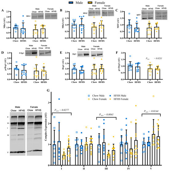 Skeletal Muscle Mitochondrial Dynamics. (A), Protein content of Mitofusin-1 (Mfn1) (n = 10, 11, 10, 10, respectively, for M Chow, M HFHS, F Chow, and F HFHS). (B), Protein content of mitofusin-2 (Mfn2) (n = 10, 11, 11, 10, respectively). (C), Protein content of mitochondrial fission factor (MFF) (n = 10, 11, 11, 10, respectively). (D), protein content of phosphorylated dynamin-related protein 1 (pDrp1) (n = 10, 11, 11, 10, respectively). (E), protein content of dynamin-related protein 1 (Drp1) (n = 10, 11, 11, 10, respectively). (F), ratio of pDrp1 to total Drp1 (n = 10, 11, 11, 10, respectively). (G), protein content of mitochondrial complexes (n = 9, 10, 10, 12, respectively). Blue boxes represent males and yellow circles represent females; Open shapes represent chow fed animals and closed shapes represent HFHS fed animals. Chow = standard diet, HFHS = high-fat high-sugar diet.