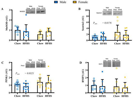 Skeletal Muscle Mitochondrial Health. (A), protein content of manganese superoxide dismutase (MnSOD) (n = 8, 9, 8, 7, respectively, for M Chow, M HFHS, F Chow, and F HFHS). (B), protein content of Sestrin2 (n = 10, 10, 11, 10, respectively). (C), protein content of PTEN-induced kinase 1 (PINK1) (n = 10, 11, 10, 10, respectively). (D), protein content of Bcl-2-interacting protein 3 (BNIP3) (n = 7,8,9,8, respectively). Blue boxes represent males and yellow circles represent females; Open shapes represent chow fed animals and closed shapes represent HFHS fed animals. Chow = standard diet, HFHS = high-fat high-sugar diet.