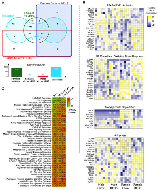 RNA Sequencing. (A), Venn Diagram and quantification of the number of transcripts shared between group pairs. (B), Significance of pathway enrichment by group. (C), Relative expression of genes within the PI3K/AkT Signaling Pathway, NRF2- Mediated Oxidative Stress Pathway, Triacylglycerol Degradation Pathway, and Autophagy Pathway. Chow = standard diet, HFHS = high-fat high-sugar diet.