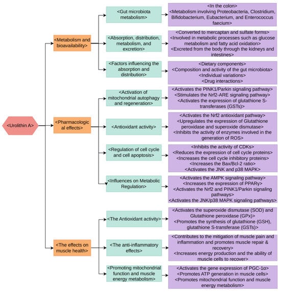 Following absorption in the intestines, Urolithin A enters the circulatory system and is transported to various tissues and organs through the bloodstream [11,23]. Studies have indicated that in the human body, Urolithin A primarily exists in a free form rather than being bound to other molecules [24]. Once inside the cell, Urolithin A undergoes further metabolism through multiple metabolic pathways [25]. One prominent pathway involves the conversion of Urolithin A into its mercaptan and sulfate forms, facilitated by metabolic enzymes present in the liver [26]. Furthermore, some studies have suggested that Urolithin A may participate in metabolic processes such as glucose metabolism and fatty acid oxidation. Urolithin A and its metabolites can be excreted from the body through the kidneys and intestines [25]. A portion of Urolithin A is further metabolized into other compounds within the intestines before being eliminated through feces [24]. These processes may be influenced by factors such as intestinal permeability, renal function, and individual characteristics.