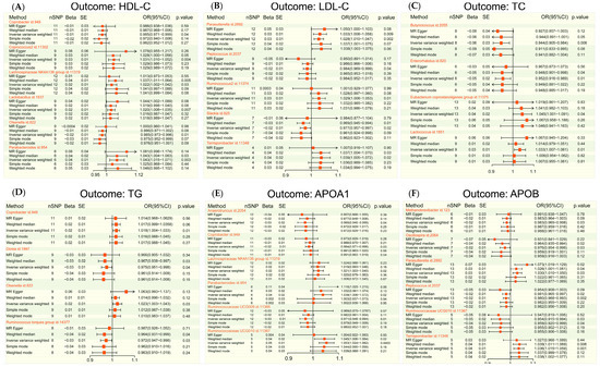 In the context of two-sample MR Analysis, we have effectively discerned six gut microbiota genera that exhibit causality towards HDL-C (Figure 1A), five towards LDL-C (Figure 1B), four towards TC (Figure 1C), four towards TG (Figure 1D), six towards APOA1 (Figure 1E), and six towards APOB (Figure 1F). It is worth noting that the number of independent IVs employed varied across the different sets of causal associations under investigation. Based on the final results, it is evident that the distribution of gut microbiota genera exhibiting a negative causal association with various forms of dislipidemia (OR < 1, p value of IVW < 0.05) can be outlined as follows: Coprobacter and Olsenella for HDL-C (Figure 1A), Peptococcus and Slackia for LDL-C (Figure 1B), Butyricicoccus and Enterorhabdus for TC (Figure 1C), Dorea and Ruminococcus torques group for TG (Figure 1D), Anaerotruncus, Coprobacter, and Ruminococcaceae UCG009 for APOA1 (Figure 1E), and Methanobrevibacter, Oscillospira, Peptococcus, and Ruminococcaceae UCG010 for APOB (Figure 1F). This observation suggests that an increase in the abundance of these bacterial genera in the gut is associated with a decrease in the production of the corresponding lipids. In contrast, the distribution of gut microbiota genera that exhibit a positive causal association with various types of dyslipidemia (OR > 1, p value of IVW < 0.05) is as follows: Coprococcus2, Lachnospiraceae NK4A136 group, Lactobacillus, and Parabacteroides for HDL-C (Figure 1A), Parasutterella, Ruminococcus2, and Terrisporobacter for LDL-C (Figure 1B), Eubacterium coprostanoligenes group and Lactococcus for TC (Figure 1C), Coprobacter and Olsenella for TG (Figure 1D), Lactobacillus, Parabacteroides, and Ruminococcaceae UCG010 for APOA1 (Figure 1E), and Parasutterella and Terrisporobacter for APOB (Figure 1F). The results indicate that a higher prevalence of these bacterial species in the gastrointestinal tract is associated with elevated levels of certain lipids. Supplementary Materials S1 offers extensive details on the association between statistically significant gut microbiota genera and various types of lipid disorders in the MR analysis.
