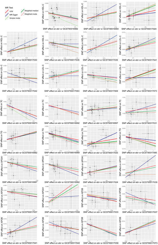 Sensitivity tests were conducted using the MR Egger test to investigate the presence of horizontal pleiotropy among various gut microbiota genera associated with different types of dyslipidemia. The results revealed no significant evidence of horizontal pleiotropy, as indicated by p values exceeding 0.05 for the MR-Egger regression intercept approach (Table S2). However, there was significant heterogeneity (p < 0.05) in the causal associations between Olsenella and TG, Anaerotruncus, Ruminococcaceae UCG009, and APOA1, and the effect size for these associations was estimated using the random effect model of the IVW method, while a fixed effects model was employed to assess other causal effect sizes. The ultimate findings demonstrated that all effect values were statistically significant (p < 0.05, Table S2), thereby confirming the causal association between these gut microbiota genera and the regulation of lipid metabolism. Furthermore, the sensitivity analysis was performed using the leave-one-out method to assess the impact of individual SNPs on outcome estimation, and the findings consistently persisted (Supplementary Materials S2). The scatter plot, depicting the MR estimate of the effect of various gut microbiota genera on different dyslipidemia types, exhibited a clear linear trend (Figure 2). The funnel plot demonstrated minimal heterogeneity (Supplementary Materials S3). Collectively, these pieces of evidence strongly support the statistical robustness of the analysis results and the reliability of the conclusion.
