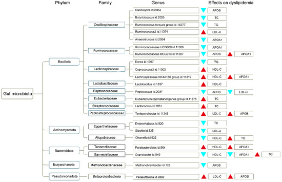 To enhance the understanding of the regulatory influence of gut microbiota genera on dyslipidemia, we summarized the phylum and family corresponding to different gut microbiota genera and their effects on different types of dyslipidemia, as shown in Figure 3.