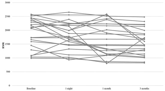 To evaluate differences in BMR over time, ANOVAs for repeated measures were conducted. The within-subject factor was time, and the between-subject factors were ESS, AHI, REM index, mean and minimum saturation. The results showed a significant main effect of “time” on BMR [F(3, 69) = 7.835, p < 0.001, η2 = 0.254], indicating a significant reduction of BMR over time. Specifically, LSD post hoc comparisons revealed a significant reduction in BMR after 1 night (p = 0.041), after 1 month (p = 0.012), and after 3 months (p < 0.001) compared to baseline values (Table 3 and Table 4). In addition, a significant reduction in BMR was also observed at 3 months compared to that at 1 night. No significant interaction was observed between time and ESS [F(3, 66) = 0.674, p = 0.571, η2 = 0.030], AHI [F(3, 66) = 0.018, p = 0.997, η2 = 0.001], REM index [F(3, 66) = 0.936, p = 0.428, η2 = 0.041], mean [F(3, 66) = 2.607, p = 0.059, η2 = 0.106], minimum saturation [F(3, 66) = 1.194, p = 0.319, η2 = 0.051], and BMI [F(3, 66) = 0.270, p = 0.847, η2 = 0.012] (Table 5) (Figure 1).