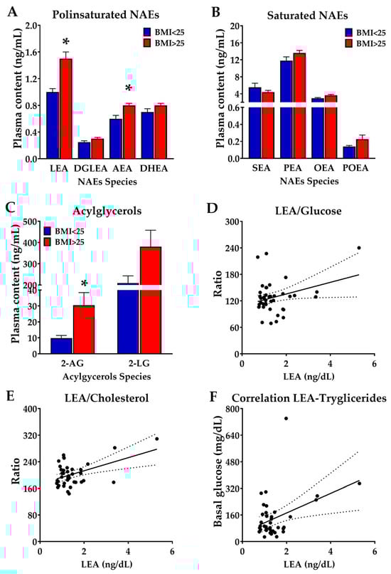 (A,B); Plasma concentrations of NAEs in a representative Mediterranean population of Spain (city of Pizarra) stratified on the basis of their body mass index in lean (BMI < 25, N = 13) versus obese (BMI > 25, N = 34) subjects. (C) Plasma concentration of the acylglycerols 2-Arachidonoyl glycerol (2-AG) and 2-LG in the same population. Correlation of plasma LEA concentrations with that of (D) glucose, (E) cholesterol, and (F) triglycerides. Dashed lines correspond to confidence intervas * p < 0.05 versus BMI < 25 patients (ANOVA).
