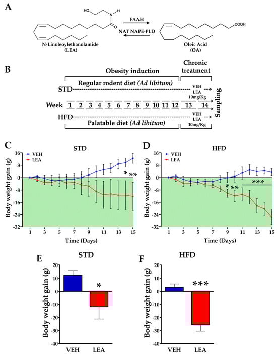 (A) Chemical structure of LEA and linoleic acid and the enzymes involved in their degradation (Faah) and synthesis (Nat, Nape-Pld). (B) Design of the study on the effects of LEA administration in eight male rats (N = 6–8 animals/group). (C,D) Daily effect of LEA treatment on weight gain in the animals of the two diets groups. (E,F) Cumulative weight gain after 15 days of treatment; * p < 0.05, ** p < 0.01, and *** p < 0.001 denote LEA versus VEH group (two-way ANOVA).