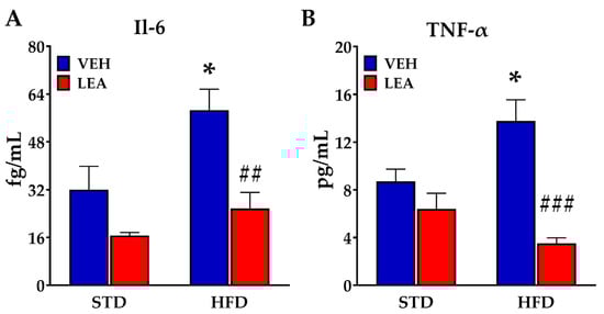 LEA treatment reversed the HFD-induced increase in the plasma concentration of Interleukin-6 (Il-6, A) and tumor necrosis factor alfa (Tnf-α, B). Data are presented as means ± standard error of the mean (N = 6–8 animals/group). * p < 0.05 different versus vehicle group; ## p < 0.01 and ### p < 0.01 different versus VEH-treated group of the same diet (two-way ANOVA).
