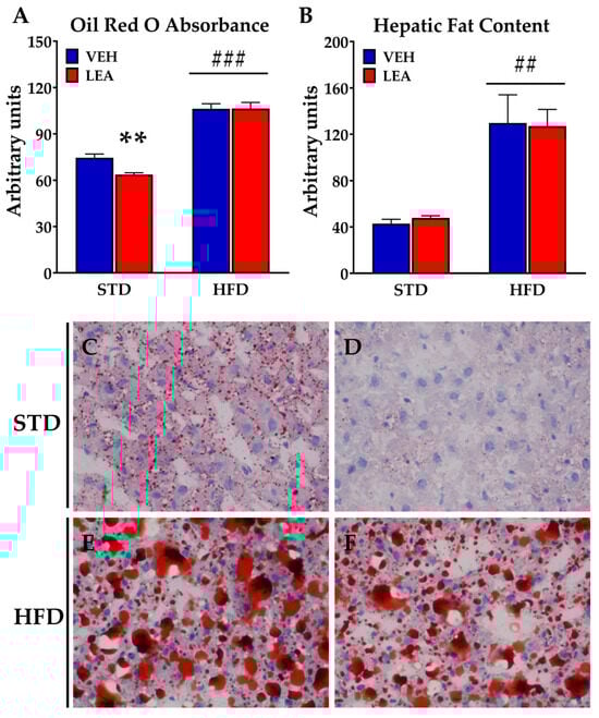 LEA treatment did not reverse the liver steatosis associated with HFD exposure in male rats. (A) Fat content measured using oil red staining; (B) fat content measured using organic extraction; (C) oil red staining of a liver section from a STD–VEH-treated animal; (D) oil red staining of a liver section from a STD–LEA-treated animal; (E) oil red staining of a liver section from a HFD–VEH-treated animal; (F) oil red staining of a liver section from a HFD–LEA-treated animal. Data are presented as means ± standard error of the mean (N = 6–8 animals/group). ** p < 0.01 versus STD-fed animals treated with vehicle; ## p < 0.01 and ### p < 0.001 versus STD-fed animals treated with LEA (two-way ANOVA).