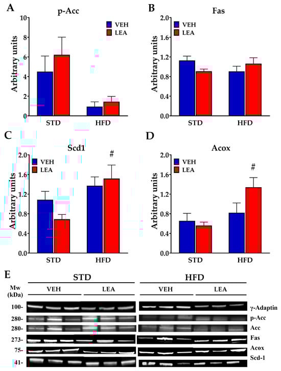 LEA treatment did not modify the alterations in the lipogenic pathway in the liver of male rats exposed to a HFD, but it did activate peroxisomal oxidation. (A) The HFD activated Acetyl-CoA-Carboxylase (Acc) by removing inhibitory phosphorylation; (B) neither HFD nor LEA modified fatty acid synthase (Fas); (C) exposure to the HFD increased the activity of the Stearoyl-CoA-desaturase 1 (Scd1) enzyme; (D) LEA treatment increased the expression of peroxisomal acyl-CoA-oxidase (Acox). (E) Representative blots immunostained for each of the proteins tested. Data are presented as means ± standard error of the mean (N = 6 animals/group). # p < 0.01 versus STD-fed animals treated with LEA (two-way ANOVA).
