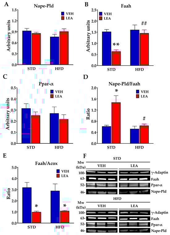 Effects of HFD exposure and/or LEA treatment on NAE signaling machinery. (A) Neither HFD nor LEA modified the NAE-releasing enzyme N-acyl phosphatidylethanolamine-specific phospholipase D (Nape-Pld); (B) LEA treatment reduced the expression of Faah, the main NAE-degrading enzyme, in the STD-fed animals; (C) neither HFD nor LEA modified the NAE receptor Ppar-α; (D) treatment with LEA markedly enhanced the production/degradation ratio of NAEs in the STD-fed animals; (E) LEA treatment markedly reduced the Faah/Acox ratio in the liver of animals independently of the diet; (F) representative blots immunostained for each of the proteins tested. Data are presented as means ± standard error of the mean (N = 6 animals/group). * p < 0.05, ** p < 0.01 versus STD-fed animals treated with vehicle; # p < 0.05 and ## p < 0.01 versus STD-fed animals treated with LEA (two-way ANOVA).