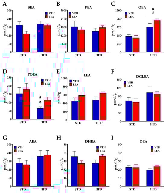 Effects of either HFD exposure or LEA treatment on the content of NAEs in the liver of male rats. (A) Stearoylethanolamide, SEA; (B) palmitoylethanolamide, PEA; (C) oleoylethanolamide, OEA; (D) palmitoleoylethanolamide, POEA; (E) linoleoylethanolamide, LEA; (F) di-homo-γ- linolenylethanolamide, DGLEA; (G) arachidonoylethanolamide, AEA; (H) docosatetraenoylethanolamide, DEA and (I) docosahexaenoylethanolamide, DHEA. Data are presented as means ± standard error of the mean of the six to eight determinations per group (N = 6–8). * p < 0.05 versus STD-fed animals treated with vehicle; # p < 0.05 versus STD-fed animals treated with LEA (two-way ANOVA).