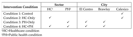 Participants living in three cities (El Centro, Brawley, and Calexico) within Imperial County, California, were assigned to one of four study conditions. The three intervention conditions included combinations of interventions implemented in the healthcare (HC) sector and the public health (PH) sector. A number of interventions were implemented within the HC sector, including expanded provider training of child obesity assessments and community health worker (CHW)-led healthy lifestyle workshops. The HC intervention occurred within a Federally Qualified Health Center (FQHC) with a clinic site in each of the three participating cities. The PH intervention occurred in ECE centers, schools, community recreation organizations, and restaurants. The first condition served as a control with no intervention, the second condition included only HC sector intervention (HC-only), the third condition included only PH sector intervention (PH-only), and the fourth condition included interventions implemented both in the HC and PH sectors and is referred to herein as “HC + PH.” The intervention strategies are described in detail below in Table 1, Section 2.4, and in Ayala et al. [23].