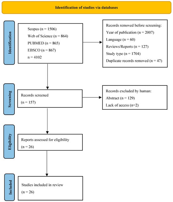 Searches comprised a combination of MeSH terms and keywords, applying quotes and field tags with Boolean operators. For all databases, five primally exclusion steps were determined: 1. keywords (“bread AND fortifi*”), 2. year, 3. language (English), 4. publication type (article), and 5. study type (clinical trial). For non-medical-only databases, screening was made in the following areas: Title, Abstract, Keywords and Subject Area (Scopus—Core Collection), Topic (Web of Science—Medline), and Ebsco (Health Source, Medline). The last search was carried out on 28 March 2023, due to some publishers’ delay in publishing articles from 2022. Results from each database were exported to files with the appropriate extension of CSV or Excel, and summaries were created for each database containing publication information, including abstracts. The results files are included in Data Availability Statement section The initial search resulted in 4102, from which 2007 was removed because of the year and 1705 because of the study type. After removing non-English publications and reviews and deleting duplicates, 157 records were selected for abstract review. Among these, 129 studies were excluded according to the exclusion criteria, and the full text of 26 eligible studies was included. Only studies involving humans in which comparable parameters were measured before and after the nutritional intervention, such as tests from blood, urine, or feces, were included in the review. Excluding articles occurred for different reasons: technological papers or subject or other simulation studies. Three exclusion criteria were distributed among the rejected studies, such as deviation from the topic: 51%, simulation studies such as digestion or computer simulations: 29%, and others referring to food technology or consumer acceptability. Two independent researchers reviewed the abstracts, and papers that did not meet the criteria for inclusion in the review were excluded through discussion The process of the literature search [12] is presented in Figure 1.