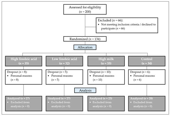 Flowchart diagram of the study population in the different phases of the study. A total of 200 subjects were screened for eligibility. In total, 66 subjects had to be excluded, so that 134 subjects were randomized to the four diet groups. After completion of the study, sorted by group, 27, 27, 23 and 28 participants were included in the statistical analysis.