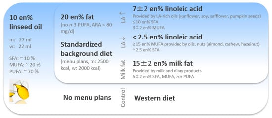 The daily intake of linseed oil constituted 27 mL for men and 22 mL for women. This dosage corresponds to around 10% of the daily energy intake (en%). In addition, the HLA, LLA, and MF groups received defined menu plans for each study day to modify the background diet and homogenize the energy intake. Participants in the control group were asked to maintain a typical Western diet (without menu plans). They also consumed the pre-defined amount of linseed oil.