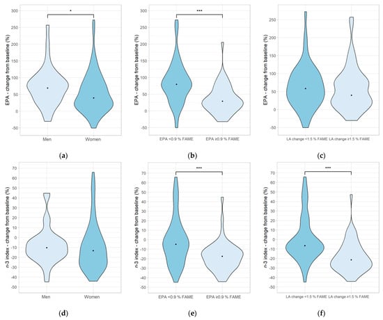 Plots (a–c) show the percentage change from baseline for EPA in erythrocyte fatty acids. Plots (d–f) show the percentage change from baseline for the n-3 index in erythrocyte fatty acids. Participants were subdivided by sex (men vs. women; plots (a,d)), by EPA status at baseline (<0.9% FAME vs. ≥0.9% FAME; plots (b,e)), and by total LA change (% FAME) comparing baseline and the end of the study (<1.5% FAME vs. ≥1.5% FAME; plots (c,f)). Percentage changes from baseline data stated below (also shown in Table S4) are either expressed as mean (±SD) or as median (25th, 75th percentile) depending on the statistical test that was performed. * p < 0.05; *** p < 0.001; Plot A: EPA percentage change from baseline, men (69.00 (34.96, 94.35), n = 35) vs. women (39.39 (12.85, 79.04), n = 68), p = 0.043; Plot B: EPA percentage change from baseline, EPA < 0.9% FAME (79.28 (45.72, 111.29), n = 54) vs. EPA ≥ 0.9% FAME (28.96 (8.61, 58.01), n = 49), p < 0.001; Plot C: EPA percentage change from baseline, LA change <1.5% FAME (58.02 (26.25, 98.35), n = 52) vs. LA change ≥1.5% FAME (39.40 (16.93, 81.19), n = 51); Plot D: n-3 index percentage change from baseline, men (−10.41 (−18.16, −2.25), n = 35) vs. women (−13.33 (−27.62, 0.32), n = 68); Plot E: n-3 index percentage change from baseline, EPA < 0.9% FAME (−4.90 (−19.79, 8.21), n = 54) vs. EPA ≥ 0.9% FAME (−17.59 (−26.72, −10.40), n = 49), p < 0.001; Plot F: n-3 index percentage change from baseline, LA change <1.5% FAME (−6.53 (−14.16, 7.86), n = 52) vs. LA change ≥1.5% FAME (−21.50 (−29.36, −10.41), n = 51); p < 0.001. Abbreviations: EPA, eicosapentaenoic acid; FAME, fatty acid methyl esters; LA, linoleic acid.