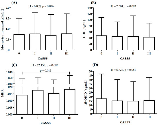 Differences in monocytes (A), high-density lipoprotein—HDL (B), monocyte-to-high-density lipoprotein ratio—MHR (C) and serum 25(OH)D (D) between patients with different CASS score: sum of points (0–III) to reflect atherosclerosis of vessels; H—Kruskal–Wallis one-way analysis-of-variance-by-ranks test.