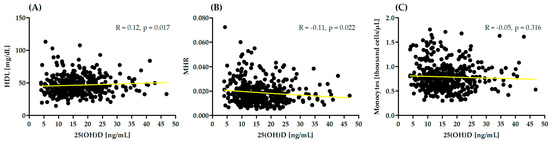Correlation between monocytes, high-density lipoprotein (HDL) (A), monocyte-to-high-density lipoprotein ratio (MHR) (B) and serum 25(OH)D concentrations (C). R—Spearman correlation coefficient.