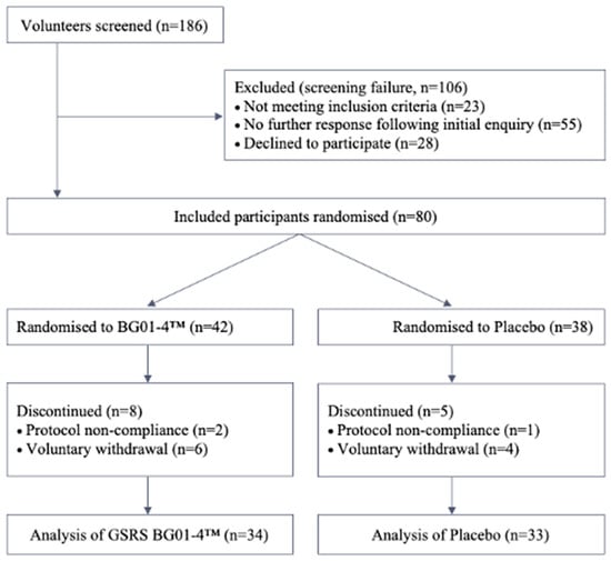 A total of 186 individuals were screened, with 80 eligible participants enrolled and randomised in the study (Figure 1). Groups were matched for age and sex (BG01-4TM: M = 23/F19, mean age 47.8 ± 14.8 years; placebo: M = 23/F19, mean age 51.9 ± 13.4 years). Compliance in the BG01-4™ group was 81%, with two participants (5%) dropping out due to not adhering to the protocol and six participants (14%) dropping out voluntarily. Similar compliance in the placebo group was found (87%), with one participant leaving due to protocol violation (3%) and four participants (10%) leaving voluntarily (Figure 1).
