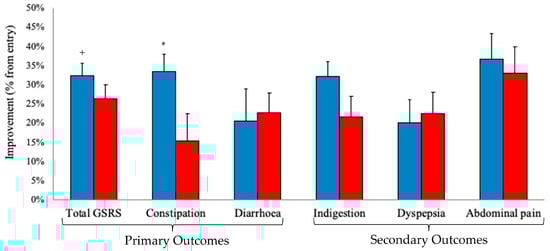 Improvement in reported GI symptoms (mean ± SD). Blue columns represent the BG-1-4TM group. Red columns represent the placebo group. Primary outcomes: total GSRS, constipation, and diarrhoea. Constipation improved for the experimental BG01-4TM group but not the control, with the alpha level (0.05) adjusted for multiple comparisons (* p = 0.0167 = 0.05/3). Diarrhoea was significantly improved for both the experimental and placebo groups. The total GSRS score improved by 11% compared to the placebo (+ p < 0.05 improvement over 4 weeks). Pre-planned secondary outcomes: All experimental and placebo groups were improved. Indigestion improved in the BG01-4TM group by 32% compared to the placebo group (21%; p = 0.079). Constipation and indigestion are both primarily controlled by lower GI tract function.