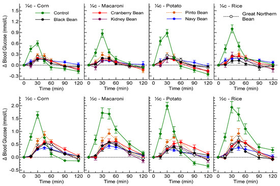 It is important to consider the magnitude of the reduction in PBGR by beans in terms of statistical and clinical significance. The mean RGR of ½ cup servings of beans varied from 32% vs. rice to 62% vs. corn, indicating that beans reduced iAUC by 38 to 68% compared to the controls—differences that were statistically significant. Further, the mean RGRs of ¼ cup servings of beans were 37–70%, indicating that iAUC was reduced by 30 to 63% compared to the control starchy foods. At an individual level, compared to corn, ½ cup of cranberry beans had a 29% lower RGR, while that of pinto beans was 20% less, but these values were not significantly different. Regardless of the level of significance, these treatment effects lower glycemic response, and if beans are used to replace some of these starchy controls, it is expected that clinically significant improvements in glycemic control will accrue [3,4,5].