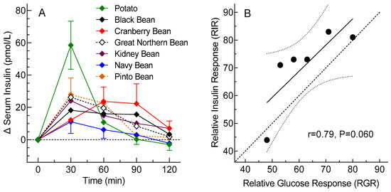 Since the glycemic response for potato was expected to be the highest among the control foods, insulin was measured only for the potato study. Mean fasting insulin across the seven treatments varied from 20 to 26 pmol/L (p = 0.57). Postprandial insulin increments are shown in Figure 2A. The insulin iAUC values did not differ significantly from a normal distribution and their means did not differ significantly among treatments (p = 0.30; Table 5). The distribution of insulin peak rises was normalized by square-root transformation, and the transformed means differed significantly among treatments (p = 0.006), with those for black and navy beans being significantly less than that for potato (Table 4). The mean ± SEM RIR of the six beans relative to potato, 71 ± 14%, did not differ significantly from the RGR for the six beans relative to potato, 62 ± 12% (p = 0.31). Although the correlation between RIR and RGR was not significant (p = 0.06), the regression line did not differ significantly from the line of identity, with the mean (95% confidence interval) slope, 0.94 (−0.05, 1.94), not differing significantly from 1 and the y-intercept, 12 (−51, 75), not differing significantly from 0 (Figure 2B).