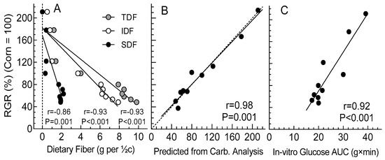 Relationships between glycemic response and in vitro analysis of beans and controls. Correlation coefficients (n = 10) and regressions for mean RGRs (relative glycemic responses) elicited by the ½ cup servings of the beans and control foods relative to corn: n = 18 for corn and the six beans, and n = 12 (drawn from the pool of n = 18) for macaroni, potato and rice. The mean iAUCs for macaroni, potato and rice were adjusted to account for the different numbers of participants in which they were tested, as described in the Methods section, and the RGR relative to corn was calculated. (A) shows the relationships between RGR and insoluble (IDF), soluble (SDF) and total dietary fiber (TDF). (B) shows the relationship between the observed RGR and that predicted by multiple regression analysis from the amounts of rapidly digested starch (RDS), slowly digested starch (SDS), resistant starch (RS) and available sugars (AS) contained in the ½ cup test means as follows (SE of the y estimate = 14.6): RGR = 23.3 × RDS + 8.3 × SDS − 20.1 × RS + 39.5 × AS − 108.2. The dashed and solid lines are the line of identity and the regression line, respectively. (C) shows the relationship between RGR and the area under the curve of glucose released during in vitro digestion (GHAUC) of the beans and control foods.