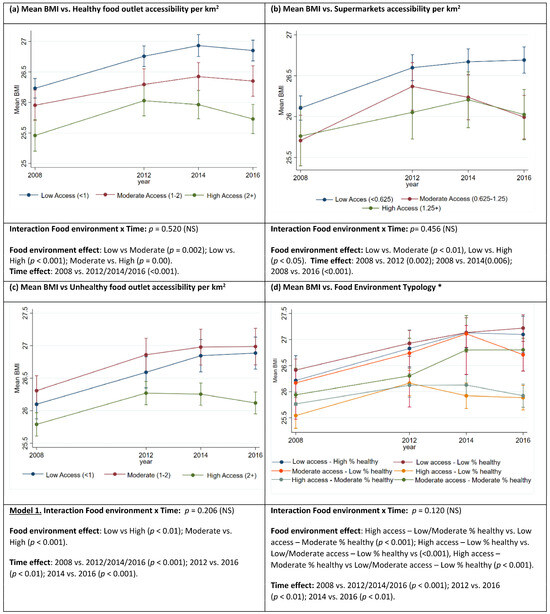 (a–d). Mean body mass index over the period 2008–2016 across postal areas grouped by food environment exposure variables. Mean BMI estimates and 95% confidence intervals were obtained under linear mixed models including postal area as a random effect, and the food environment measure (healthy, supermarkets, unhealthy food outlets, and combined measure of all outlets ‘Typology’), year, interaction food environment measure by year adjusted by age, gender, education, employment status, household income, and length of time lived in the local area. Only pairwise comparisons where p ≤ 0.05 are reported. * Food environment typology reflects postcodes grouped by similarities across relative healthy food availability (RHFA); and food retail accessibility measures to supermarkets, healthy, less healthy, and unhealthy food outlets per km2. RHFA: represents the proportion (%) of the food environment that is composed of supermarkets and greengrocers (as a proxy for healthy food) from the sum of supermarkets, greengrocers, independent takeaway, and fast-food franchise outlets within each postal area boundary. Body mass index (BMI) = weight (kg)/height2 (m2)).