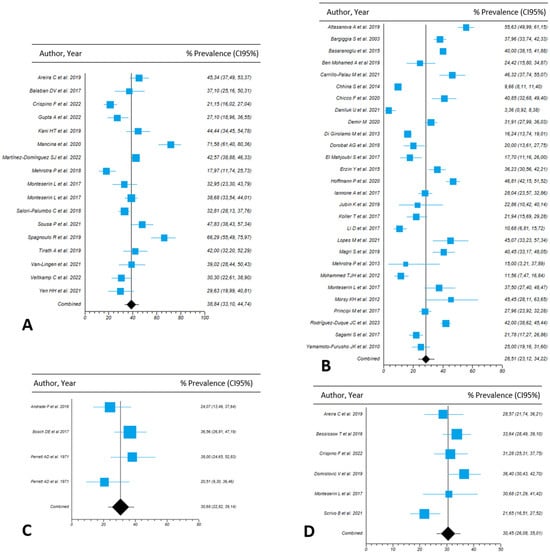 The application of the Joanna Briggs Institute Critical Appraisal Checklist for Studies Reporting Prevalence Data revealed that 44 of the 89 studies presented a high risk of bias in at least one of the domains evaluated, with Domain 4 (detailed description of study subjects and setting; n = 31 studies) [37,74,75,76,78,79,81,82,83,84,86,89,95,98,99,100,101,102,103,104,105,106,107,108,109,110,111,112,119,121,122], being the most common, followed by Domain 3 (adequacy of the sample size; n = 16 studies) [39,42,51,55,67,75,77,79,87,89,97,103,104,106,109,119], Domain 1 (appropriateness of the sampling frame to address the target population; n = 11 studies) [37,38,39,40,50,53,55,61,102,104,108], Domain 6 (use of valid methods for the identification of the condition; n = 4 studies) [74,75,119,122] and Domain 7 (measurement of the condition in a standardized and reliable way for all participants; n = 4 studies) [44,58,60,73]. Table S4 provides details of the risk of bias for all studies included in our systematic review.