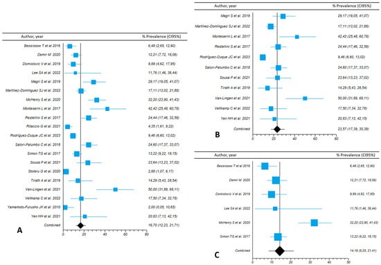 Forest plots of the pooled prevalence of liver fibrosis in patients with inflammatory bowel disease overall (A), independently of the method of assessment used. Studies using transient elastography (B) and biochemical indexes (C) are shown separately.