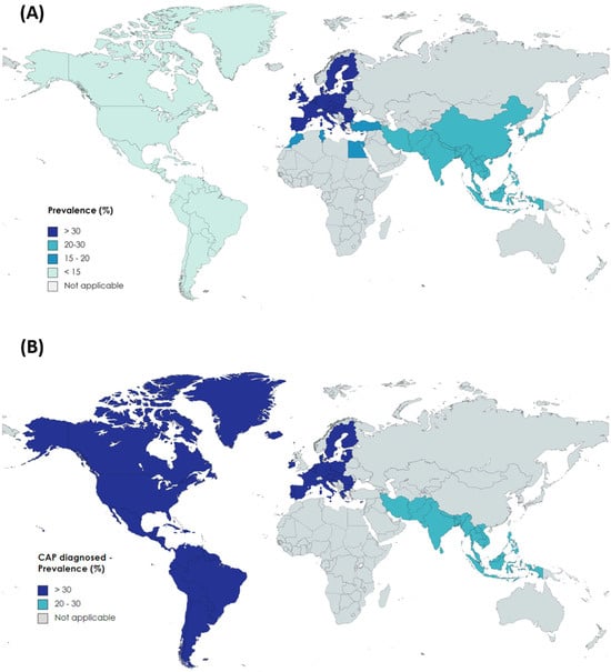 Prevalence of non-alcoholic fatty liver disease in patients with inflammatory bowel disease worldwide, according to World Health Organization regions. In (A) the result of polled prevalence of 89 studies mostly published along 2 decades; in (B) studies that used controlled attenuation parameter or CAP, as a diagnostic method, published in the 2017–2022 period.
