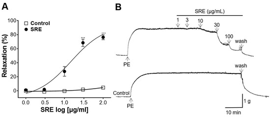 Vasorelaxant effect of Sanguisorbae radix 50% ethanol extract (SRE) on rat thoracic aortic rings pre-constricted with phenylephrine (PE, 1 μM). (A) Cumulative concentration–response curves and (B) representative traces of rat aortic rings. Values are expressed as mean ± SEM (n = 4–5). *** p < 0.001 vs. control.