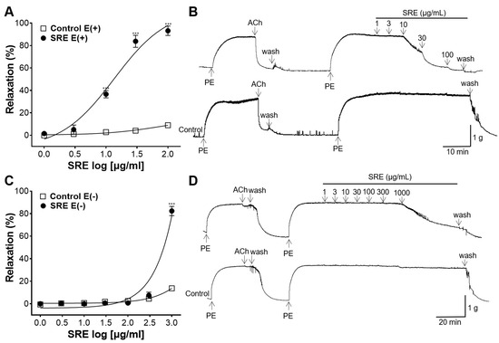 Endothelium-intact and -removed aortic rings were compared with each control group to confirm whether the vasorelaxant effect of SRE was related to endothelial cells. In the presence of the endothelium cells, SRE acted as a vasorelaxant in a concentration-dependent manner, with a maximum effect of 93.18 ± 4.20% at 100 μg/mL (Figure 2A,B). However, in the absence of cells, no significant changes were observed until the dose reached 300 μg/mL. Maximum relaxation was observed after treatment with 1000 μg/mL of SRE (Figure 2C,D).
