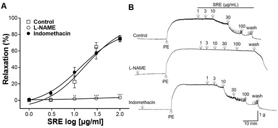 Thoracic aortic rings were pretreated with L-NAME (100 μM) and indomethacin (10 μM), and the vasorelaxant effect of SRE (1, 3, 10, 30, and 100 μg/mL) was compared with that of the control (without pretreatment) group. Pretreatment with L-NAME significantly suppressed the vasorelaxant effect of SRE (Figure 3). However, pretreatment with indomethacin showed no significant difference with the control group (Figure 3).